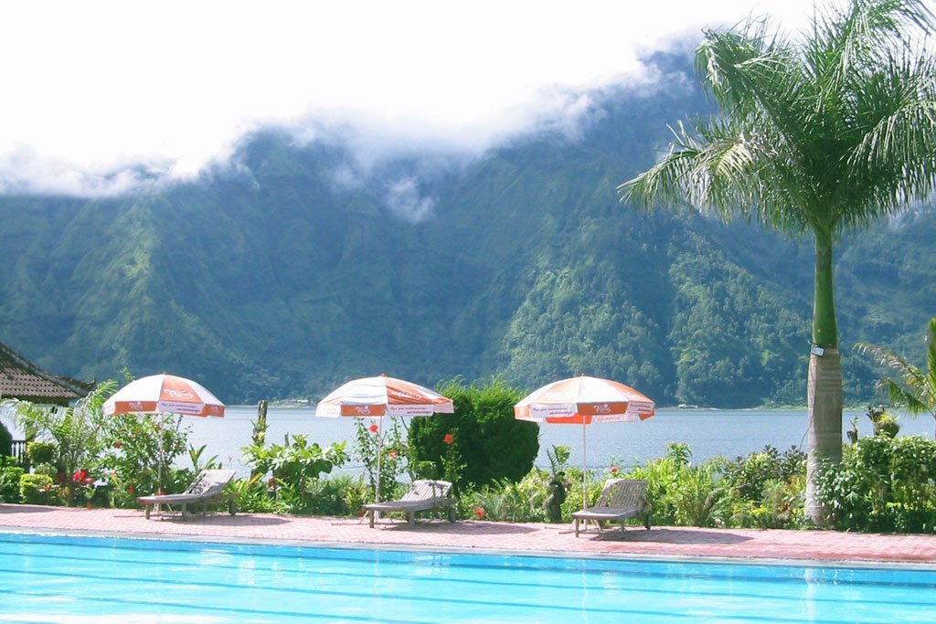 日の出に 合わせて山を 登る為 キンタマーニ高原に 前泊。 今回 宿泊したのは 日頃 キンタマーニ高原 観光 ツアーで ランチ時に 立ち寄る レイクビュー ホテル。 部屋からは バトゥール山。 バトゥール湖が 眺められとても いい景色。(画像上の右)