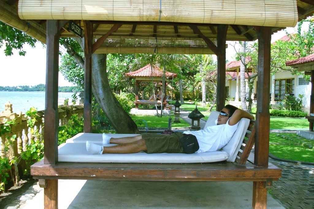 ビーチサイドのガゼボで横になってのんびりするスタッフもいれば